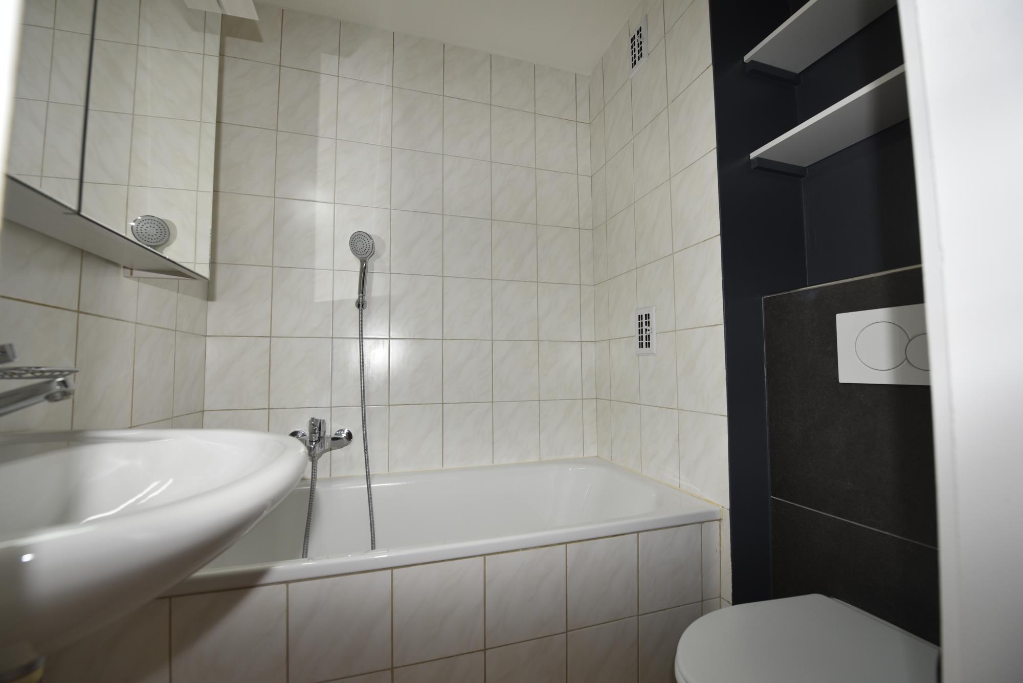 - Une salle de bains avec baignoire et WC